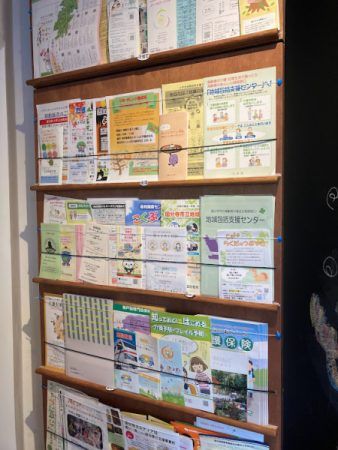 お店でお仕事もしながら喫茶店をしているなんて素敵ですね。デスクからは、窓から見えるけやき公園の緑や街ゆく人、車やバスなどを眺められ、とても気に入ってらっしゃるそうです。店内には色々な施設に関するパンフレットが置かれているのもわかりますね。