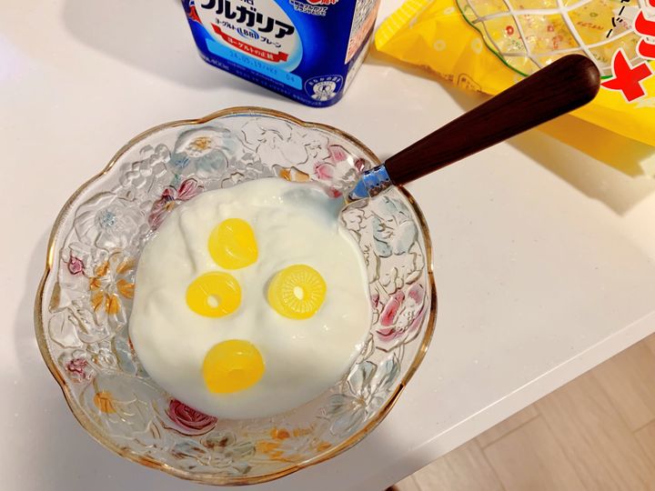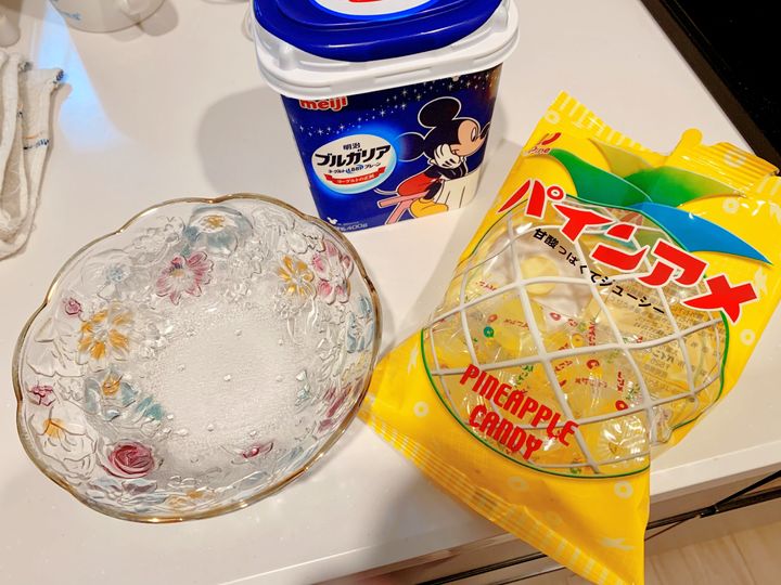ヨーグルトを可愛い器に入れて、そこにパインアメを入れます。