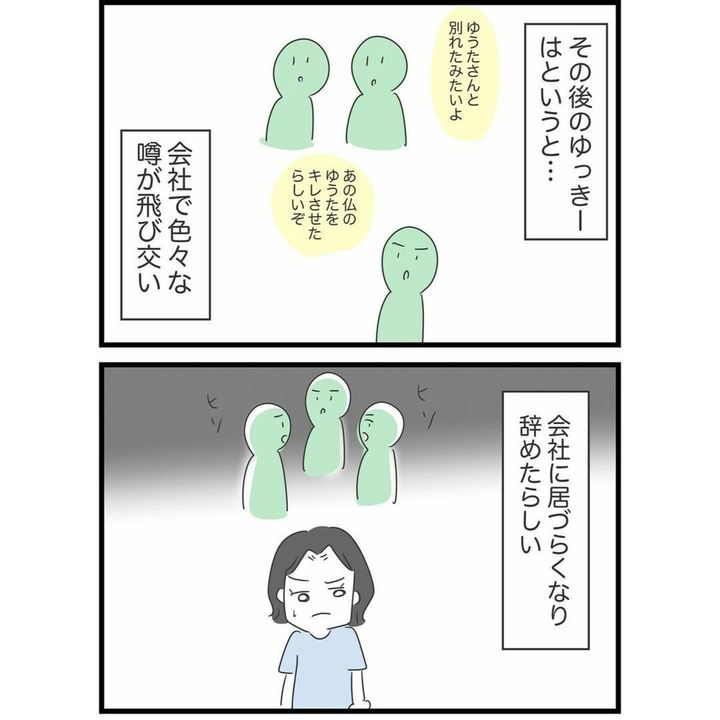 すみれさんたちのアドバイスを受け入れなかったゆっきー。彼女はその後「社内でも評判の良い彼を怒らせた女」としていろいろと噂をされ孤立、ついに退職してしまいました。すみれさんも、ゆっきーとの経験から「これからは自分と価値観の合う友人」と付き合うことを決めます。