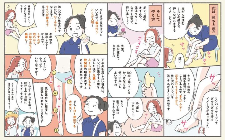 「力の入れ方や角度さえ押さえれば、リンパは自分で簡単に流すことができます。今回は下半身を中心にしたケアの方法を紹介するので、ぜひ挑戦してみて。ただし、肌が荒れているとき、アザができたときはお休みをして。熱が出てリンパが腫れているときも、避けた方がよいでしょう」
