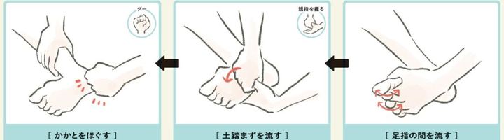 足指の間に、逆の手の指をすべり込ませる。足指の先までしっかり刺激すること。