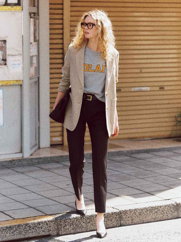 【POINT】ラフさときちんと感の間をとれるジャケットを頼りに、カジュアルなTシャツとスマートな黒をMIX。ロゴTが浮かずになじむことで、ジャケット+黒パンツでも力がはいりすぎず、肩ひじ張らない好バランスに着地。