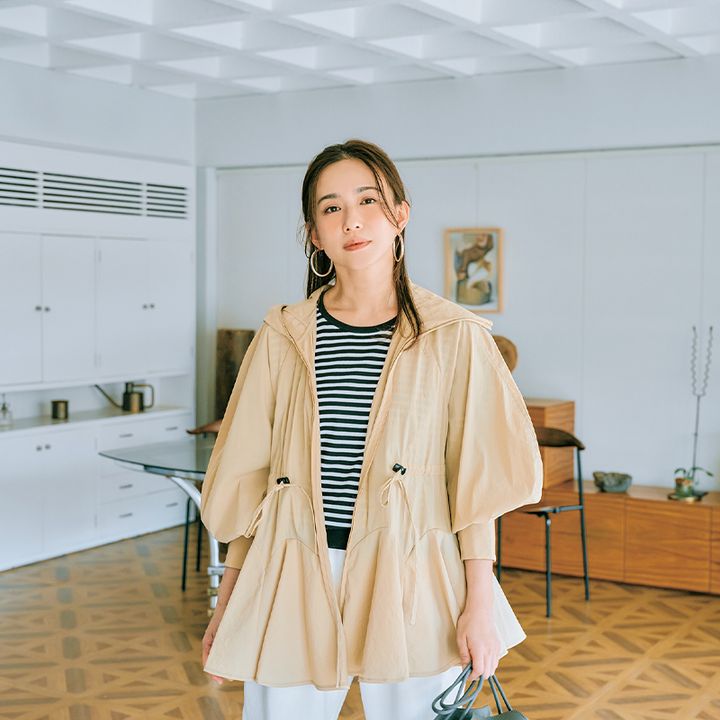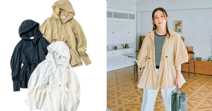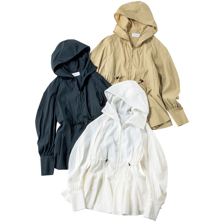 深めのフード、高めの衿のフルジップ、手の甲が覆われるサムホールなど、日焼け対策にもってこいのディテールが満載。立体的なボリューム袖や、切り替えのスカラップラインが大人の可愛さを後押しします。