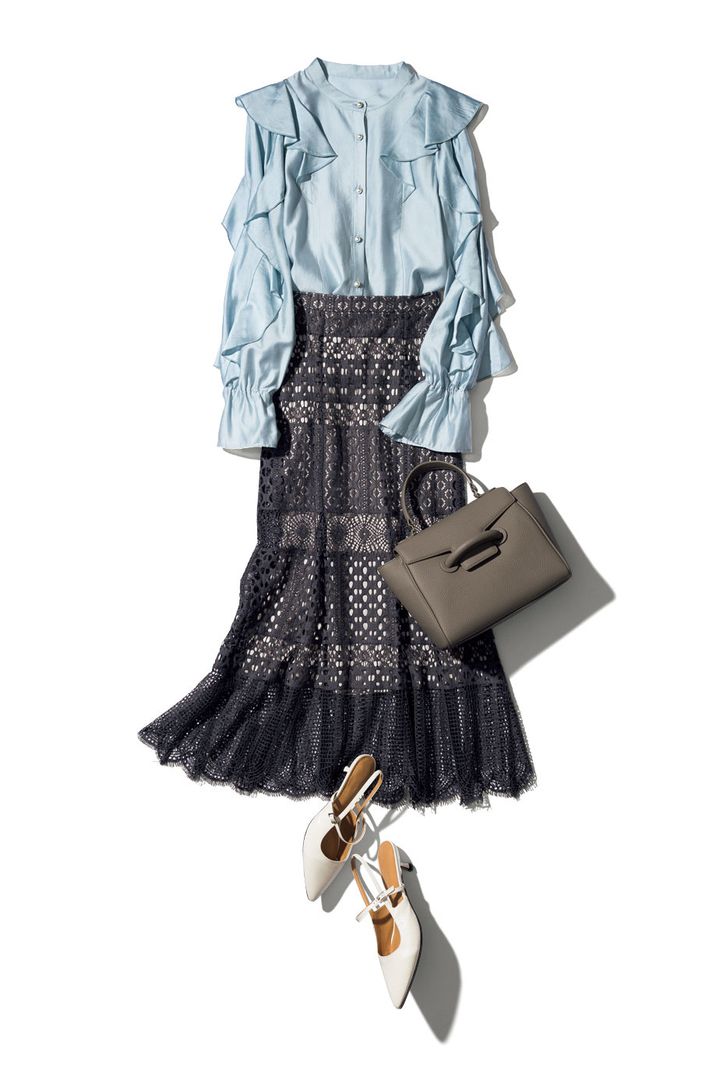 コーディネートに立体感を与えてくれるパールボタン付きのブラウス。ふんわりとした袖フリルが、二の腕の細見えもお約束。華やかなレーススカートでもシックな色みを選べば、落ち着いた印象に着こなせます。