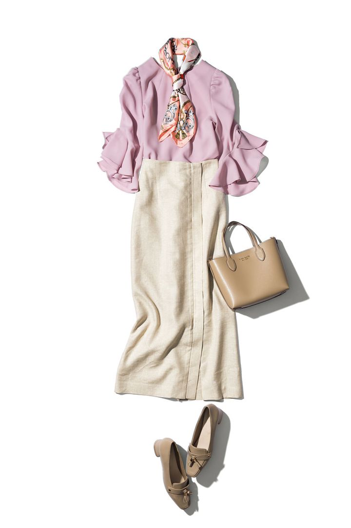 大人なくすみピンクなら甘めフリルもエレガントに。コーディネートにアクセントを与えてくれるスカーフは、ブラウスと同色のピンクベースを選べば初心者さんでも難なく取り入れられます♡
