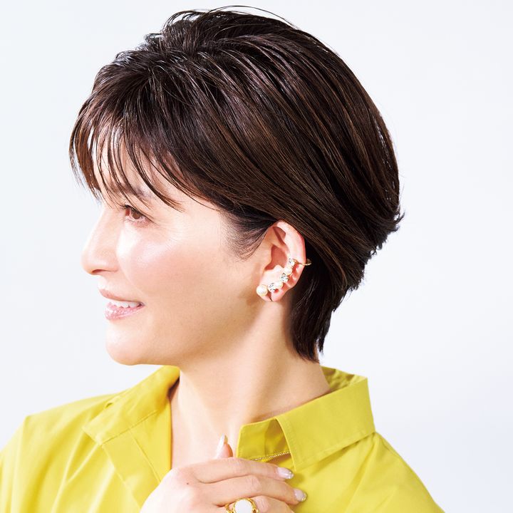 シャツ ¥31,900(ブランベール/ウールン商会)イヤリング ¥8,800 リング ¥7,700(ともにアビステ)