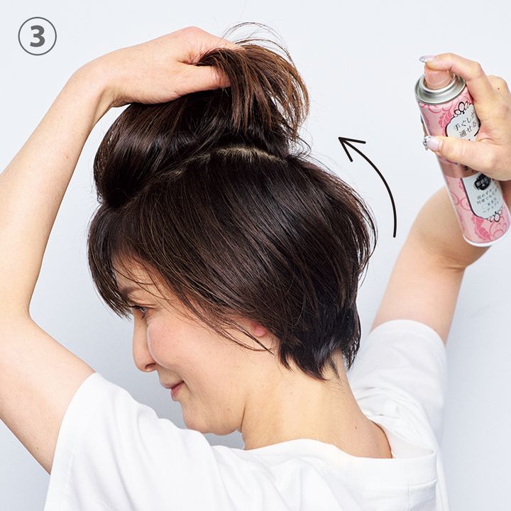 ふんわりさせたい位置の髪を摑んで持ち上げ、円を描くように満遍なくスプレー。固まらず手ぐしが通りツヤも出るキープスプレーで。