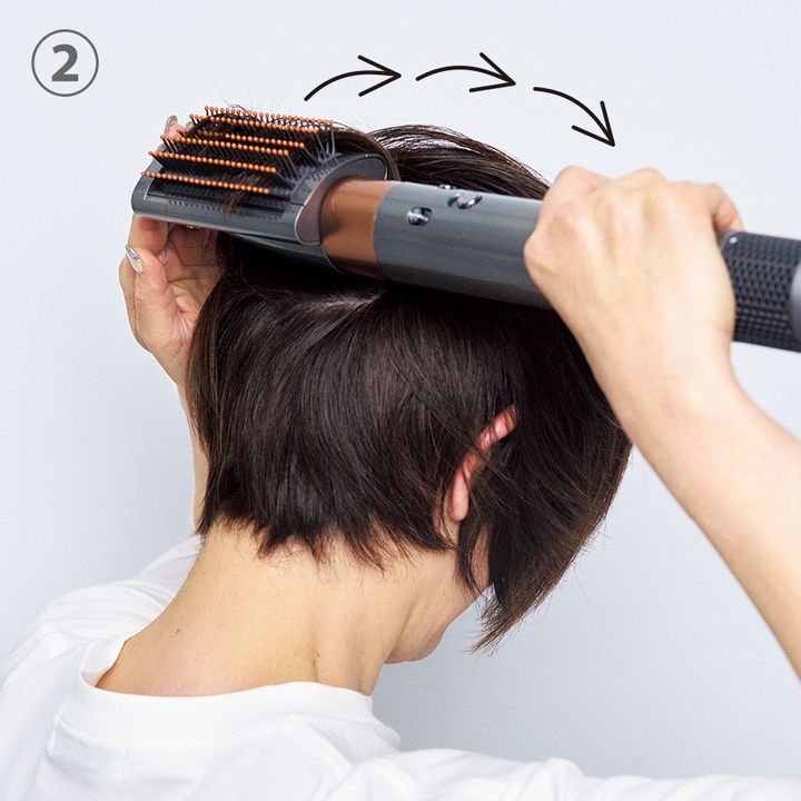 耳と同じ高さの後頭部で、ブラシの幅で毛束を取り根元にぐっとかませ、根元をふんわり。少しずつ位置をずらしトップまで繰り返す。