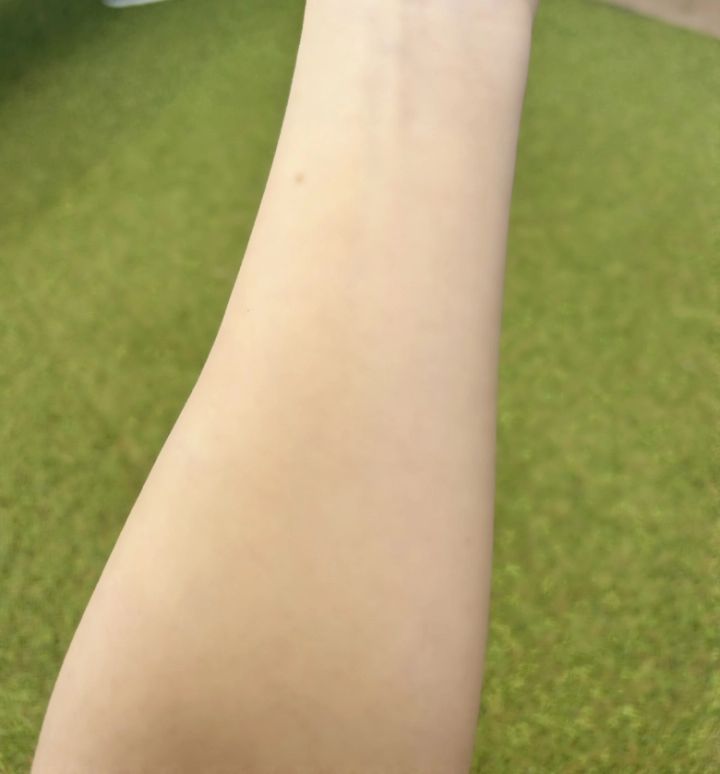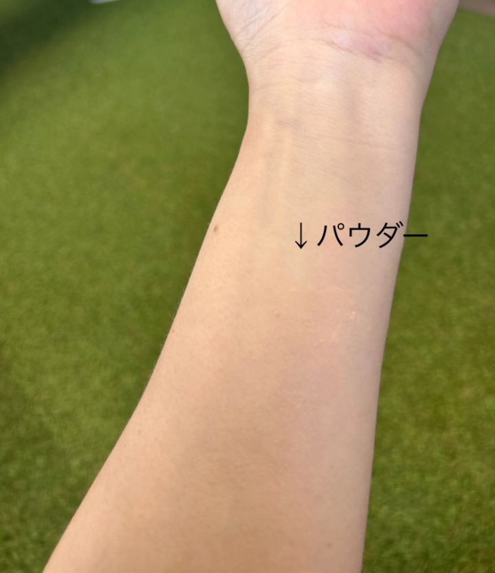 実際にママライター島田が使ってみました。まず、腕にパウダーを出した状態がこちら。