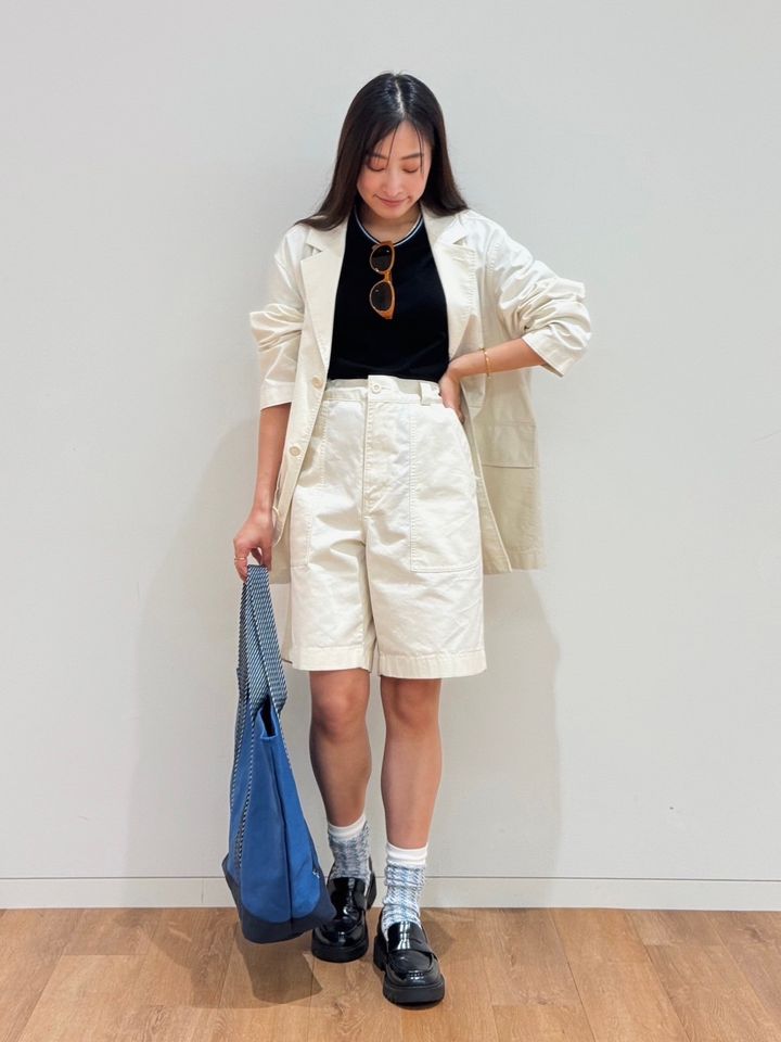 コットンジャケット¥5,990※値下げ価格[Mサイズ着用]ユーティリティワークショーツ¥1,990※値下げ価格[Mサイズ着用]クルーネックセーター(半袖)¥1,990[Mサイズ着用]ソックス¥390 バッグ¥2,990※値下げ価格(すべてユニクロ アンド ジェイ ダブリュー アンダーソン/ ユニクロ)コンフィールタッチローファー¥4,990(ユニクロ:シー/ユニクロ)オーバルキャットサングラス¥3,990(ユニクロ)