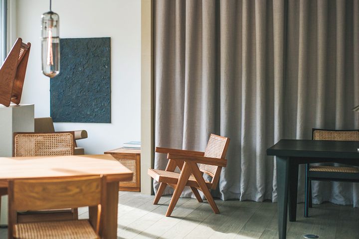 代々木公園の向かいに構える、ピエール・ジャンヌレの家具コレクションを展示・販売するショールーム。日本人作家による額や平面作品などのアートも堪能できる。