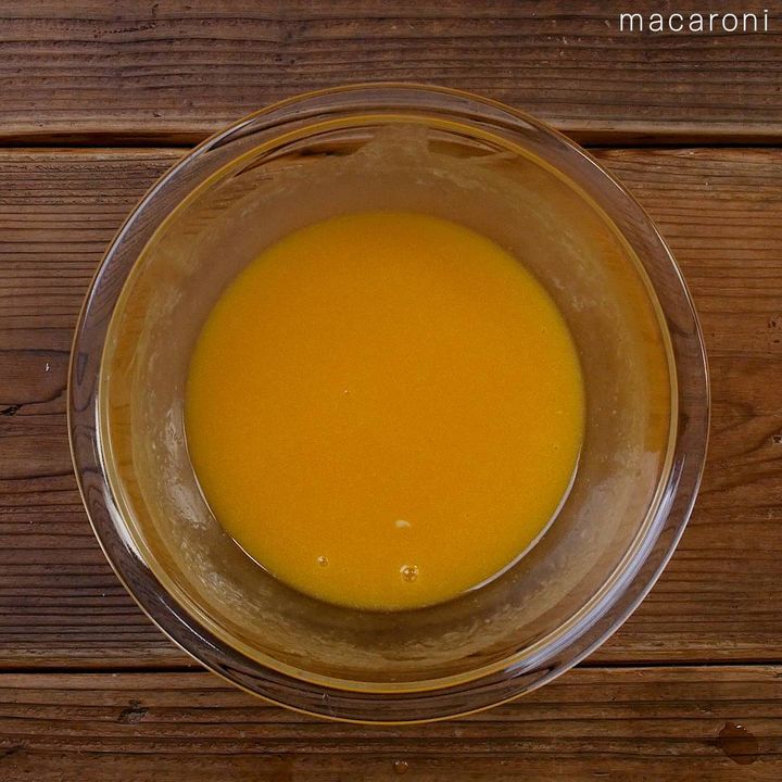 1: ボウルに卵を割り入れ、グラニュー糖、溶かしバターを加えて泡立て器で混ぜます。