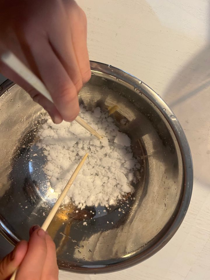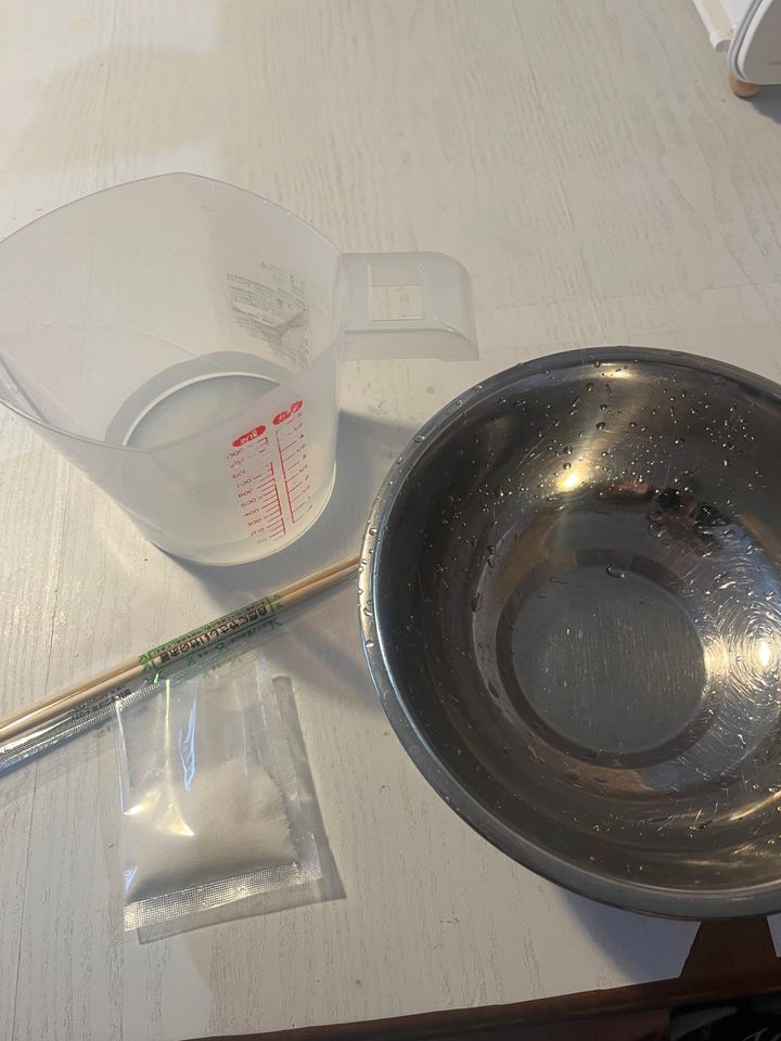 袋を開けると雪の素になる粉が入っていました。あとは割りばしと水とボウルを準備します。