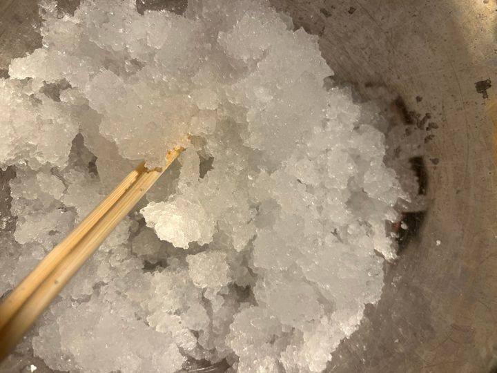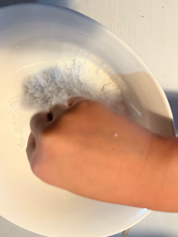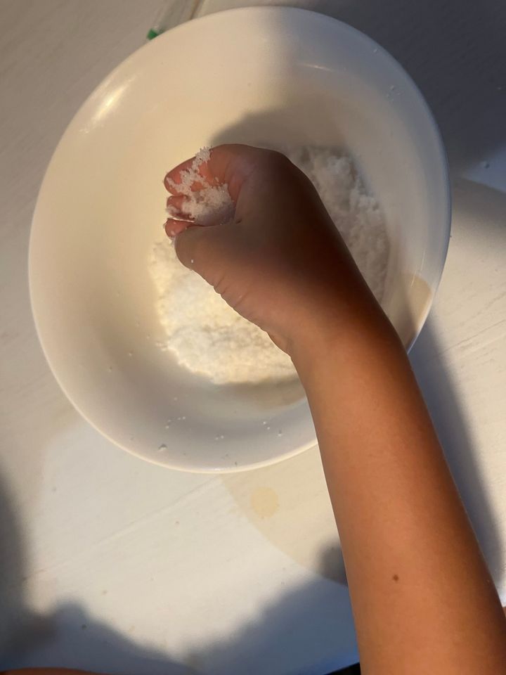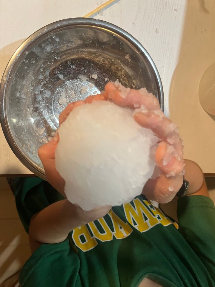 長男は「もっと水を入れたらどうなるかな?」とたくさん入れていました。するとこんなにねっとり、もはや雪というかゼリー(笑)。水が少なすぎると固まらなかったけれど、丸く固められました!