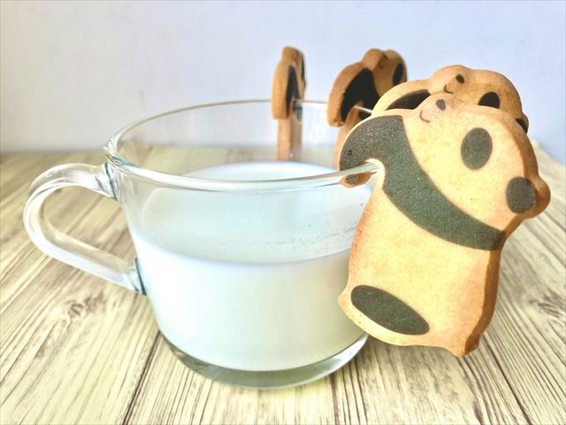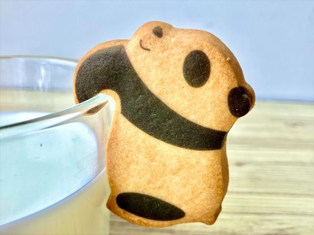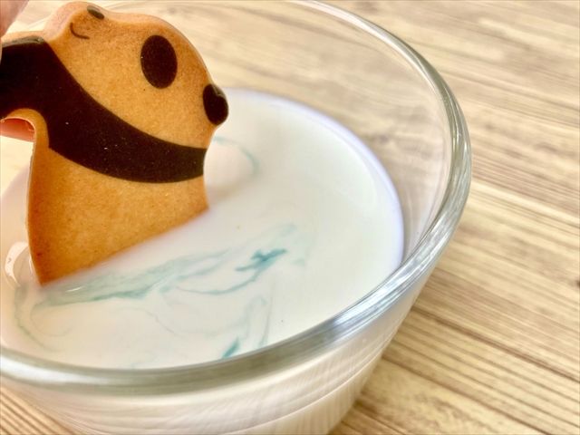 牛乳をおすすめする理由がもう一つ。このサブレ、牛乳と味の相性がとてもいいんです! ディップして食べると、サブレが少し柔らかくなって、ミルキーな味になります。また、パンダが牛乳につかってるみたいで面白い!