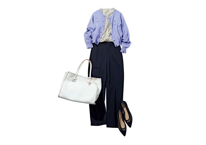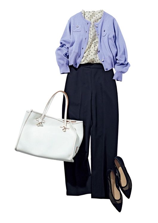 セットアップ(パンツ)¥19,910、ドットブラウス¥12,100/ともにミラ オーウェン ルミネ新宿2店 ニットカーディガン¥18,700/カデュネ トートバッグ¥69,300/ジャンニ キアリーニ(ジャンニ キアリーニ 銀座店) チュールパンプス¥2,290/GU