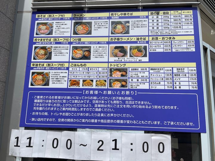 外の看板でメニューが見られるので、並んでいる間に注文を決めやすいです。 左側の写真付きの方でメニューを決めて、右上の表で麺の量を決めることができます。