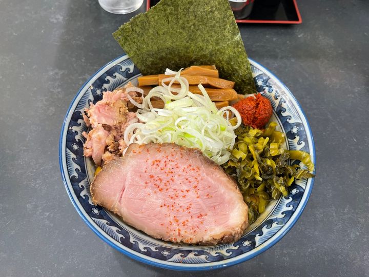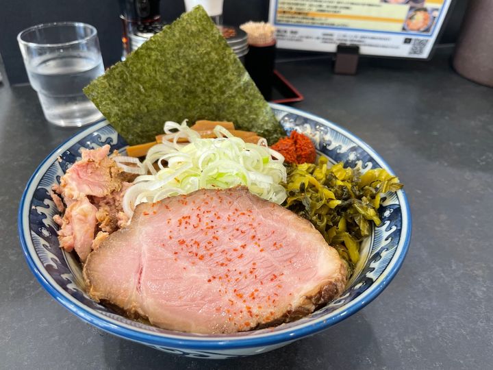 かなり大きめの1枚のチャーシューに、細かく切られたお肉、メンマ、高菜、そして辛い調味料が乗っています。 辛い調味料は、はじめから全て混ぜるのではなく、横に置いておいて、食べながら少しずつ足していくのがいいです。いきなり全部入れると、辛すぎた時に調整が難しいからです。