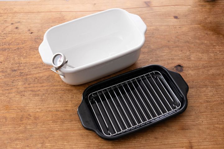 スリムな形状で、少ない油で揚げ物ができる天ぷら鍋。丸洗いできる温度計もついています。かわいい形で、キッチンでもコンパクトに揚げ物ができるのが嬉しい製品です。蓋が揚げバットになっているのも良いところ。このバットはオーブン皿としても使えます。ホーローなので、温度を一定に保ってくれるおかげで、揚げ物がカラッとおいしく揚がります。