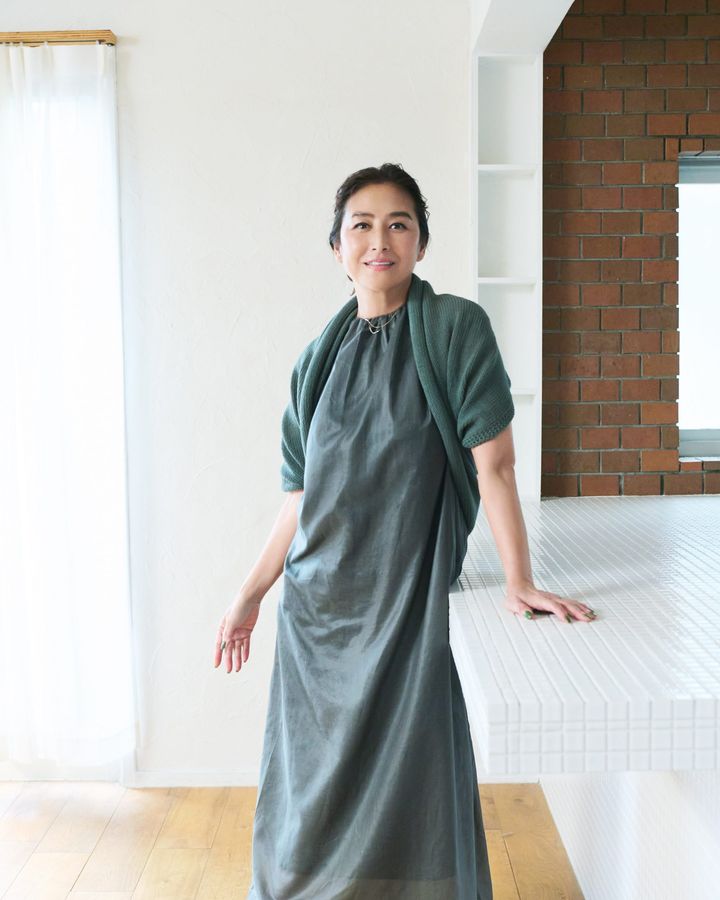 ワンピース、ニット(エーケー ワン/ビームス)、ゴールドカラーネックレス ※二連のうち1本着用 ¥17,600、シルバーカラーネックレス¥62,700(ともにMARIHA)