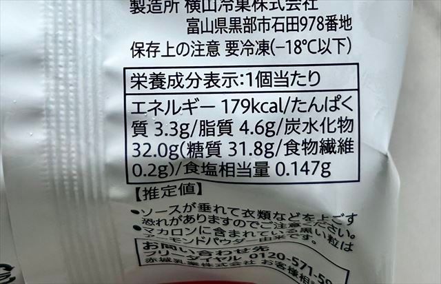 栄養成分は上記の通り。カロリーは179kcal、糖質は31.8gでした。価格は278円(税込)です。