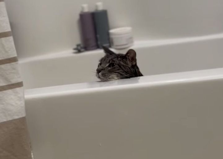 3. お風呂から出たくない猫「No!」と鳴いてお返事!