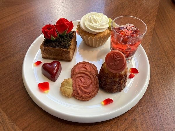写真上中央から時計回りで、「ローズカップケーキ」、「ローズペタルジュレ」、「カヌレ」、「ローズサブレ」、「ボンボンショコラ」、「プランター~ヘーゼルナッツとアプリコット~」