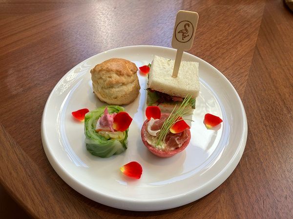 バラや春の食材を用いた、4種のセイボリーを実食。セイボリー、スイーツともに赤を基調とした食材を取り入れることで、バラの赤色を表現しています。