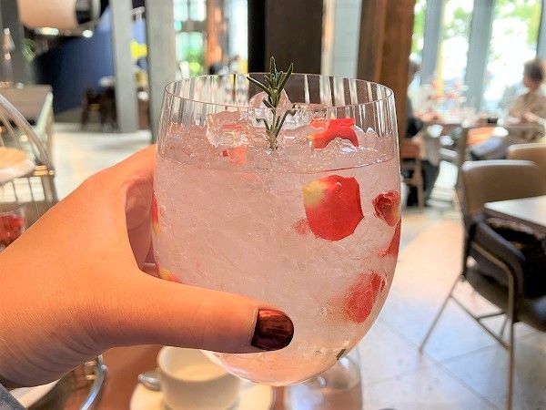 ウェルカムドリンクとして提供されたのは、バラの花びらをふんだんに使ったノンアルコールカクテル「モクテル」。トニックウォーターを使うことで、シュワシュワとしたさわやかな飲み心地に。柔らかな丸みを帯びたグラスには、ローズマリーの葉や桃のシロップが!「バラ園の世界を想像しながら飲んでほしい」という思いが込められた1杯です。