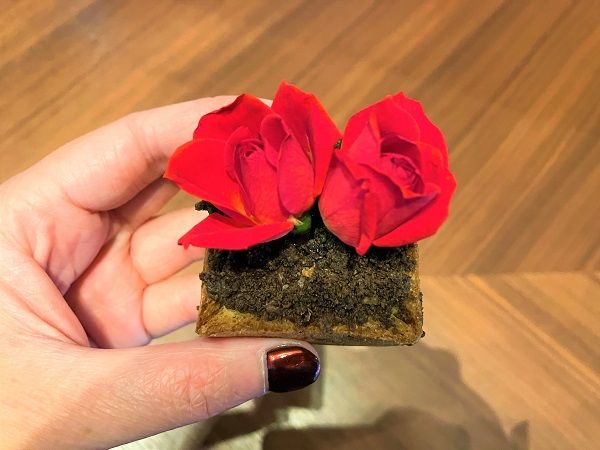 食用のミニバラをそのまま使用し、ガナッシュケーキでプランターを表現したスイーツは、まさにバラをそのまま味わっているような感覚に浸れる一品。土の部分は、ココアパウダーでざらざらとした“土の感じ”を再現しています。間近で見ると、そのクオリティーの高さに驚かされること間違いなし。