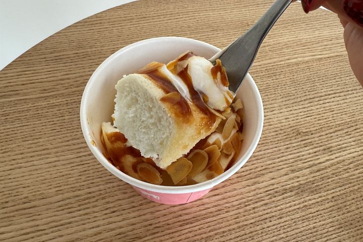 甘さを抑えた生クリームと、ほろ苦いキャラメルソースの絶妙なバランスに、トッピングのアーモンドの食感も加わり、後を引くおいしさ。あっという間にぺろりと食べられます。