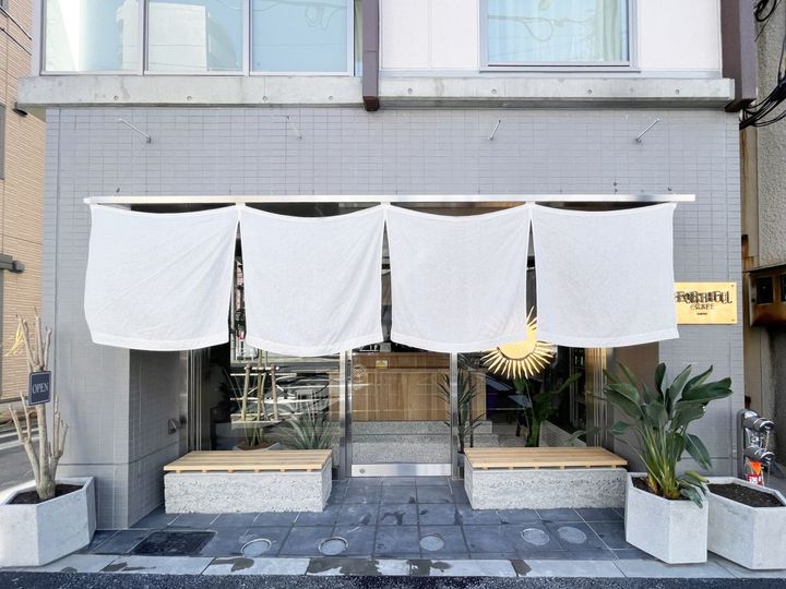 都営大江戸線蔵前駅から徒歩約5分の場所に位置する「Earthful Café Tokyo」。店先の観葉植物と大きな白いのれんが目印です。