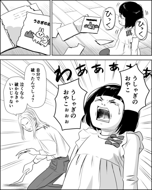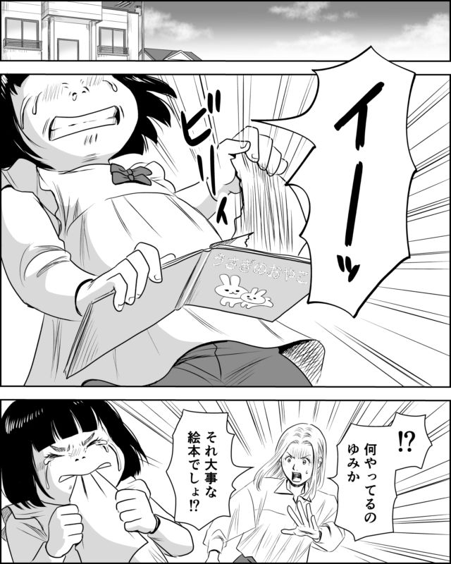 ゆみかちゃんは泣き叫びながらお気に入りの絵本を破ってしまいます。