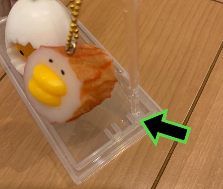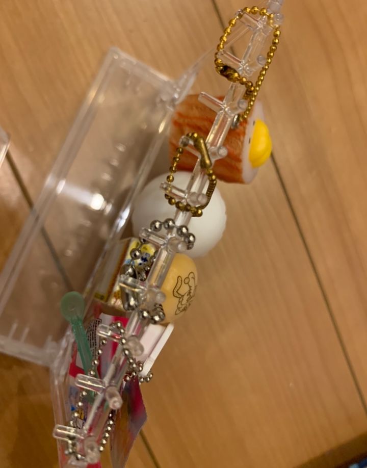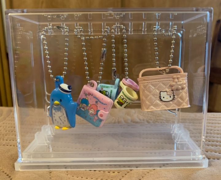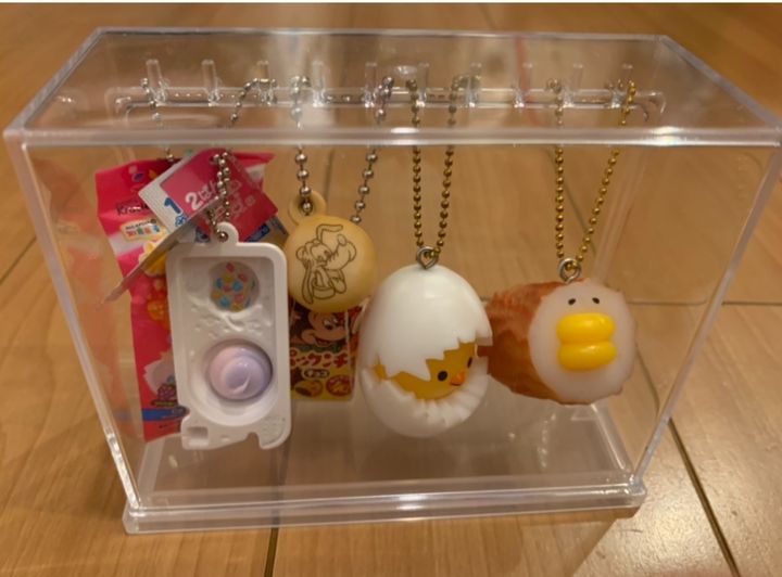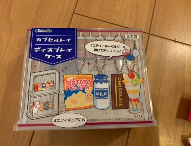 ミニチュアキーホルダーを引っかけて収納できるディスプレイケースで、チャーム系のガチャのディスプレイに特に良さそうだなぁと(^_^)