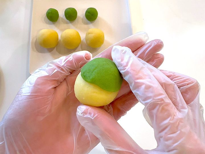残りの2/3量も4等分して丸め、抹茶の生地と合わせて再度丸める。