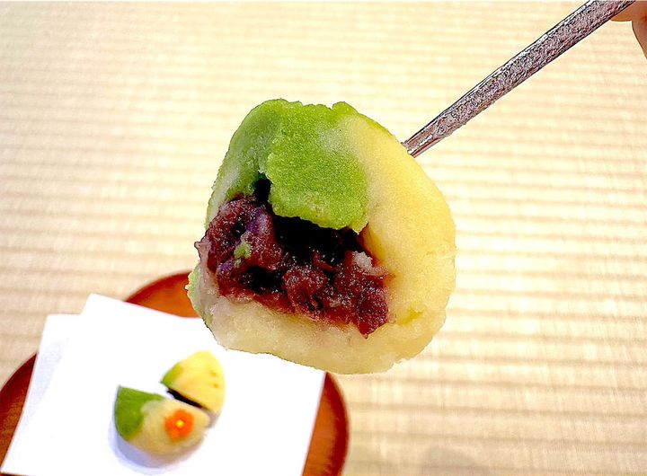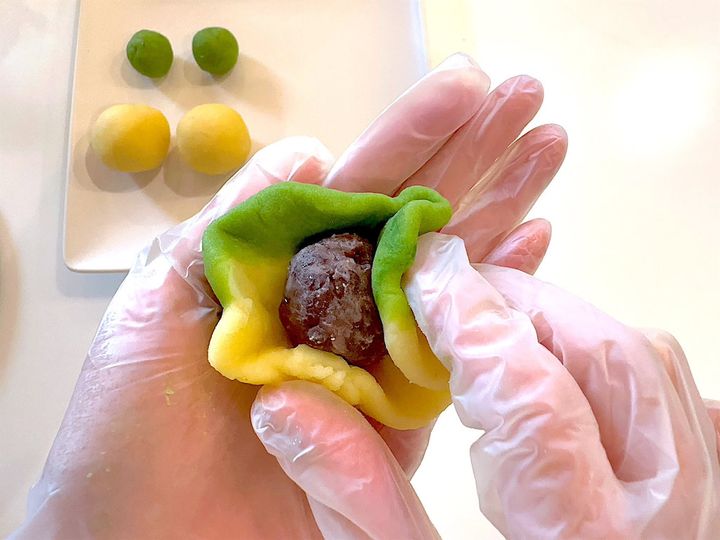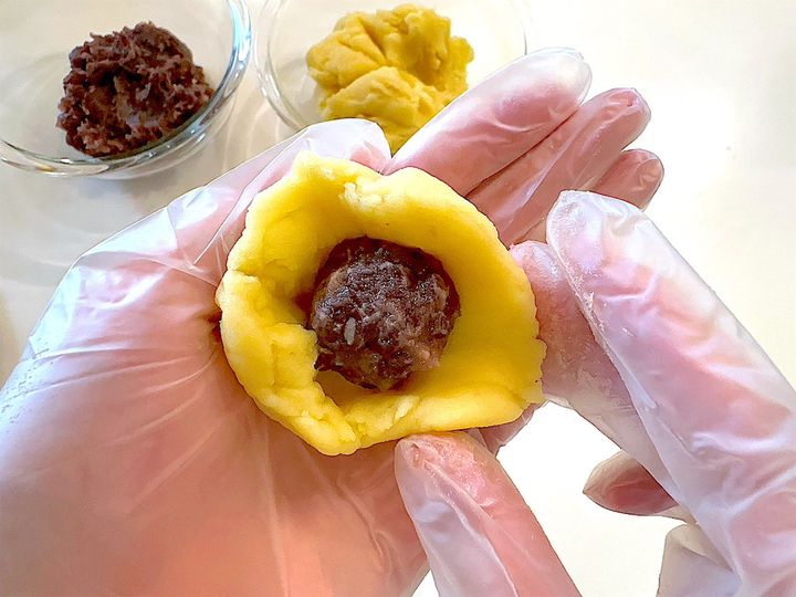 6.あんこを入れる場合は5のじゃがいもと抹茶の合わせ生地を平らに広げ、あんこを包んだら茶巾しぼりにして完成。