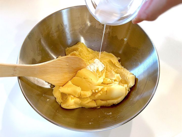 3.2を半分に分け、一方はそのまま4等分にして丸める。もし、あんこを入れる場合は平らに広げてあんこを包む。