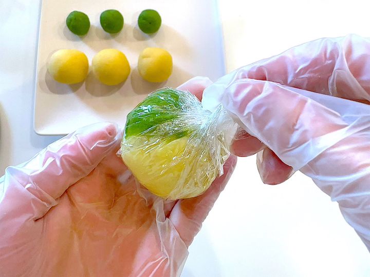 5.2で分けたもう半分の生地の1/3量に抹茶を加えて混ぜたら4等分にして丸める。