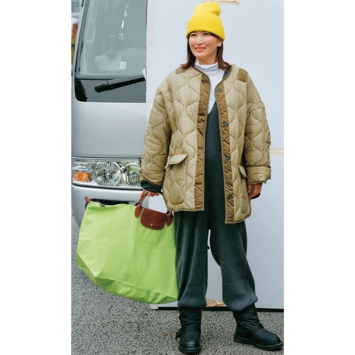 トラベルトートは、思い切り大きいサイズに短めのハンドルが可愛い。ライムカラーが地味色コーデに浮くことなく、ほどよい差し色となっています。