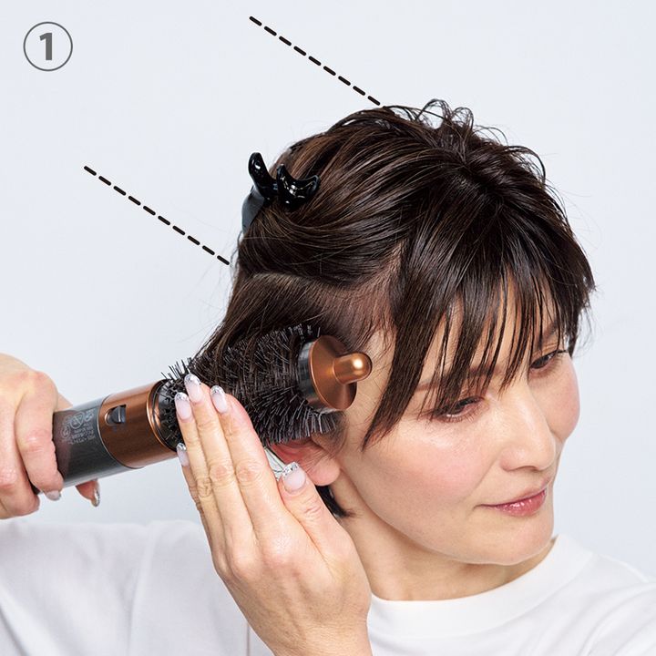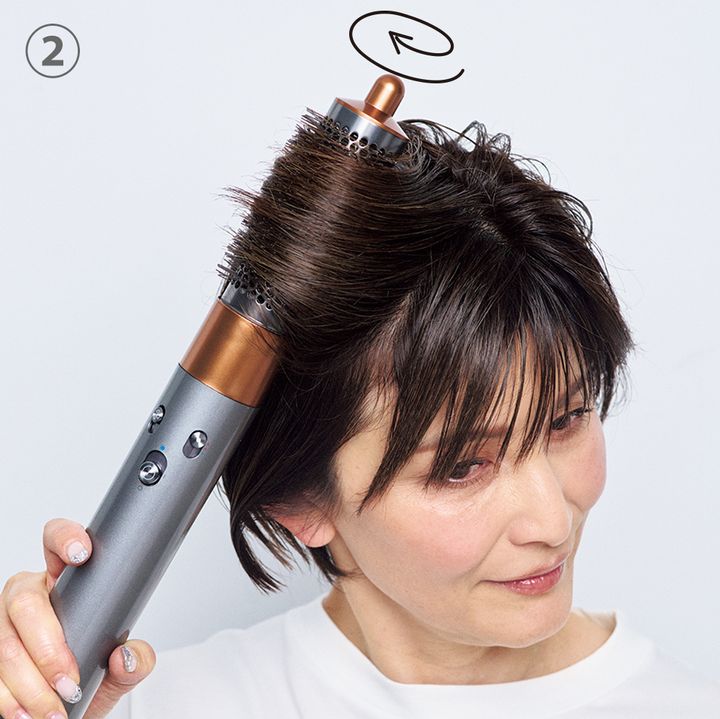 前髪以外の髪はハチ下と上に分け、ラウンドボリュームブラシでハチ下を平巻きに。左右、後ろと同様に行い、前髪も軽くくるんと。
