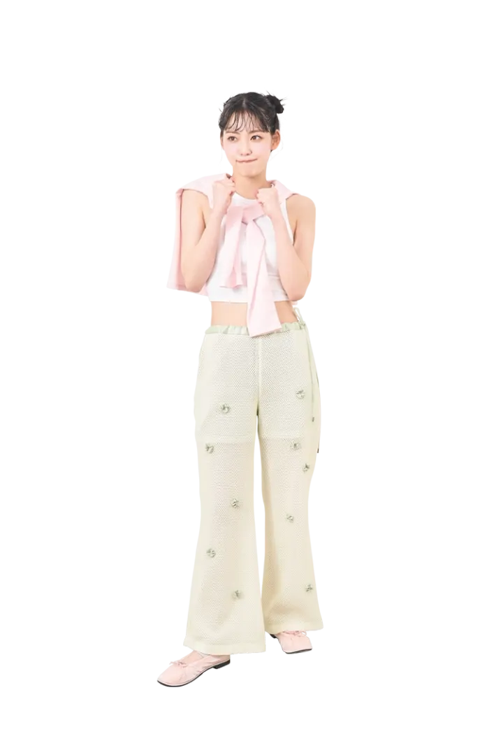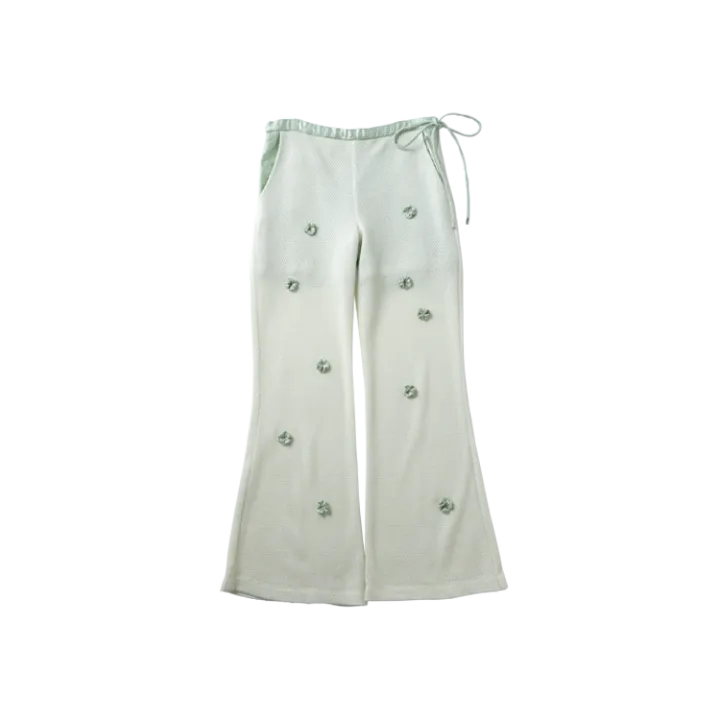 バラのモチーフがちりばめられたビジュ映えパンツ。抜け感のある透け素材と、やさしくて甘いミントカラーが乙女チックで可愛い♡