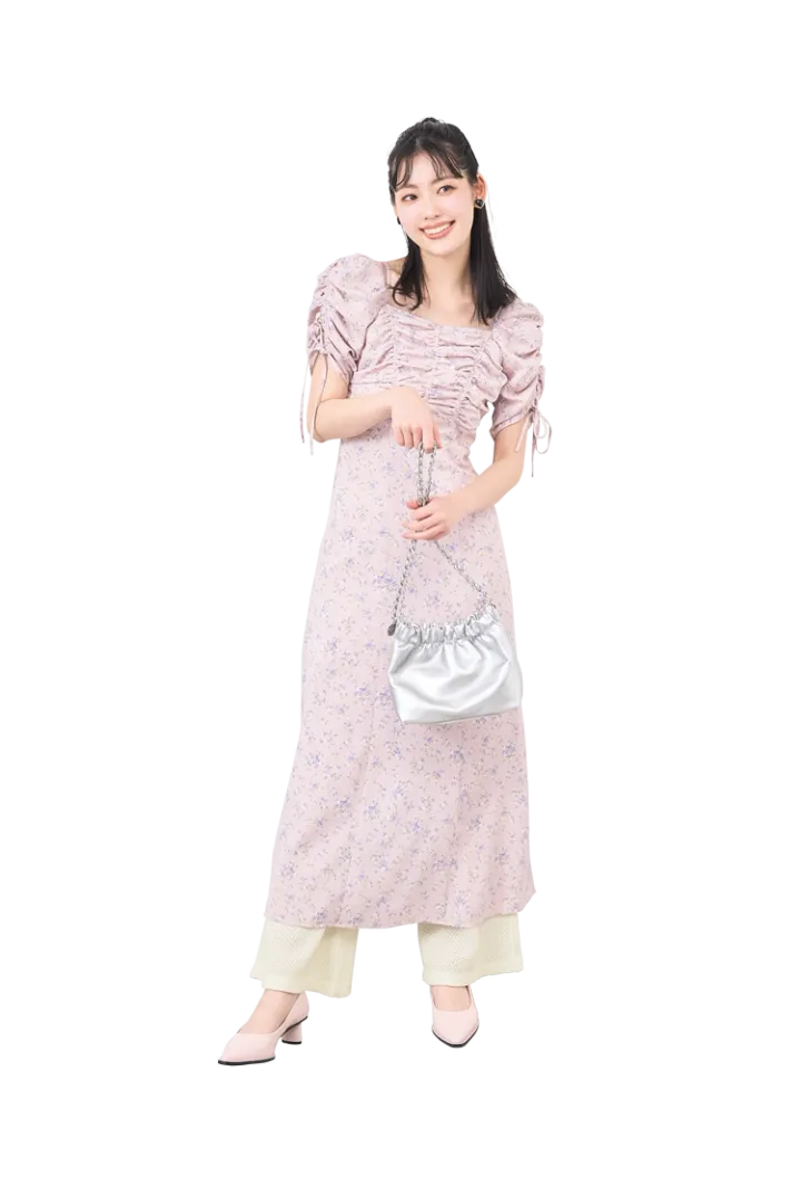 パンツは着回し。小花柄ワンピース 16,940円/SNIDEL イヤリング 660円/パリスキッズ 原宿店 バッグ 4,900円/MORE self LOVE パンプス 18,700円/piu comoda(ROSE BUD ルミネエスト新宿店)