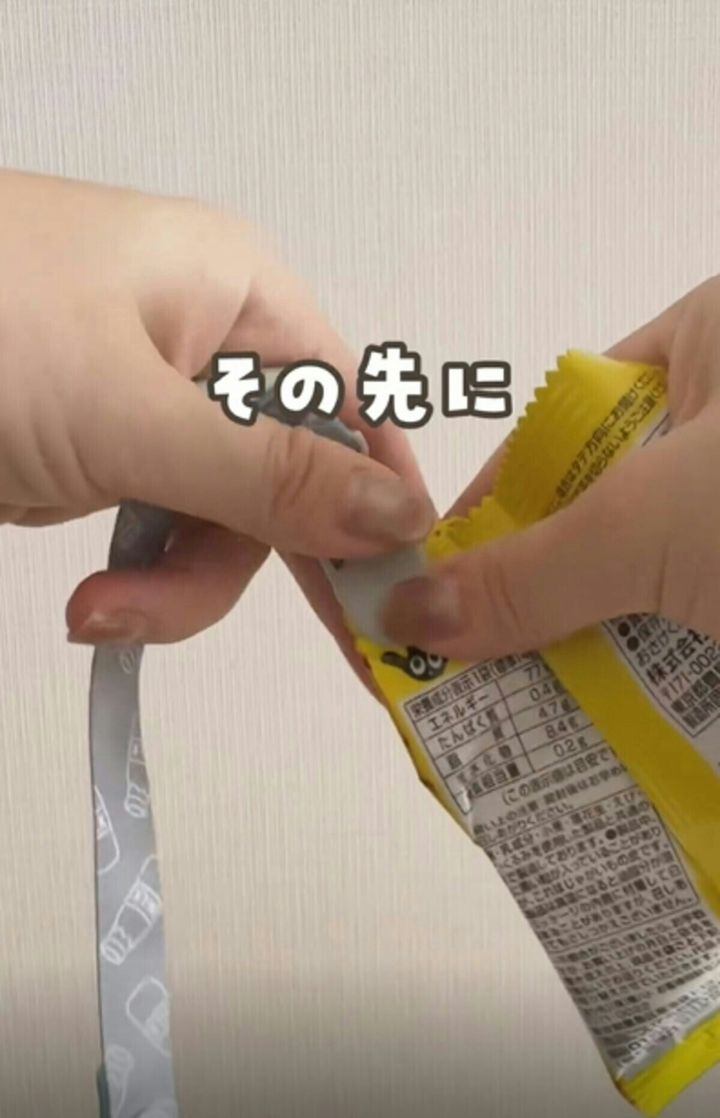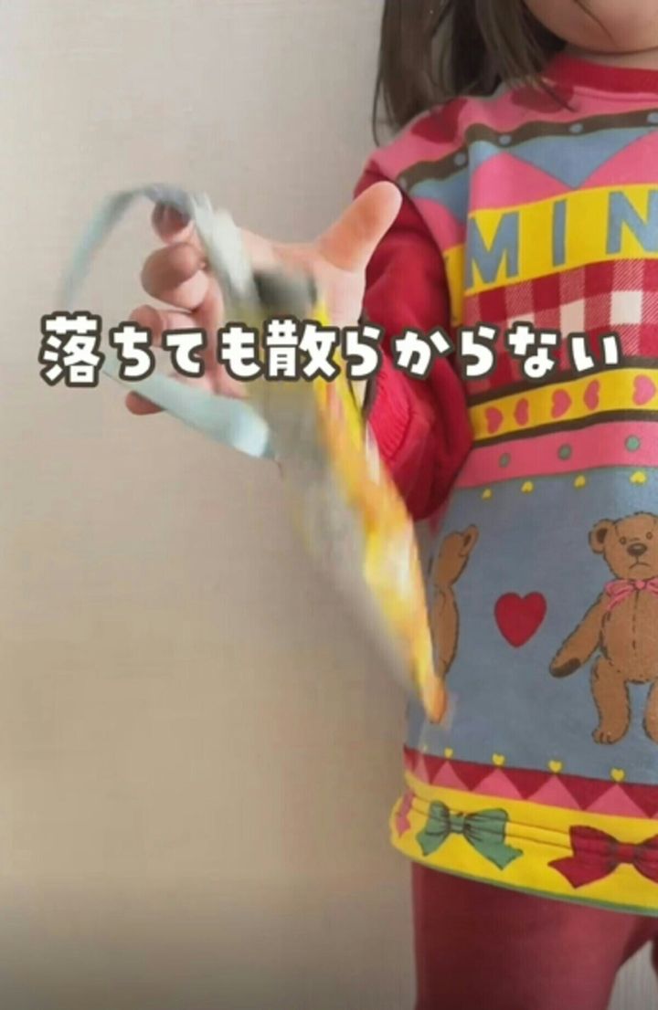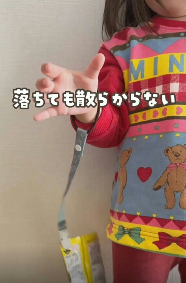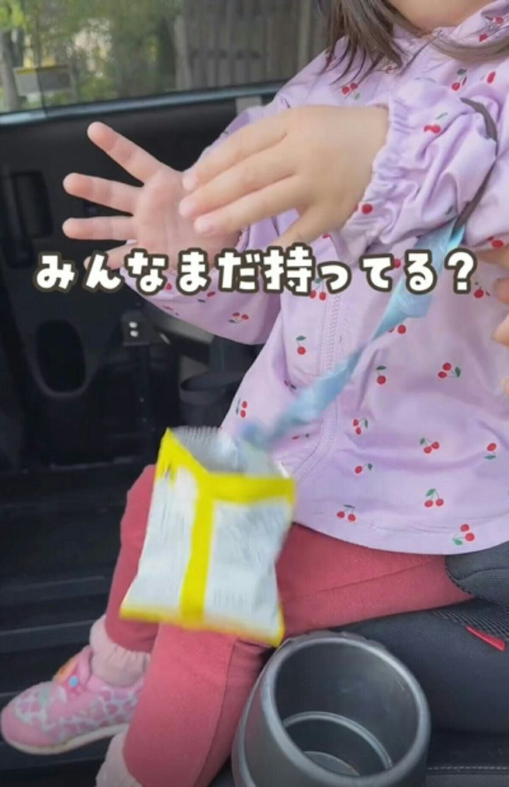 子どもがお菓子を食べる際、誤って袋ごと下に落としてしまうことがありますよね。中に入っていたお菓子が散らばり片付けが大変なことはもちろん、お菓子がなくなってしまったことで子どもの機嫌も悪くなるばかり。それが車中だと、さらに悲惨なことになりますよね。そこで、あそママ・3才と楽しむ子育てアイデア・(@asomama_ikuji)さんが紹介しているアイデアが大いに役立ちます。ぜひごらんください。