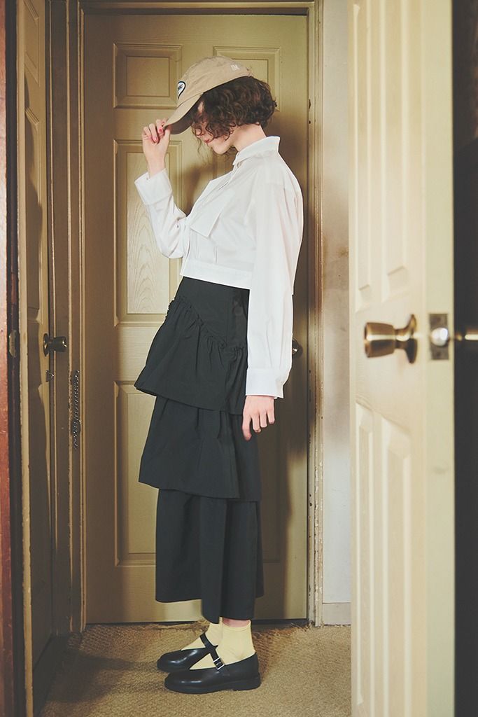 3段構造にしたティアードデザインでドレスライクなルックスに。タフタ素材でさらに立体感が増したスカートには、ショート丈の白シャツで上はとことんそぎ落とすほうがシンプルに整う。