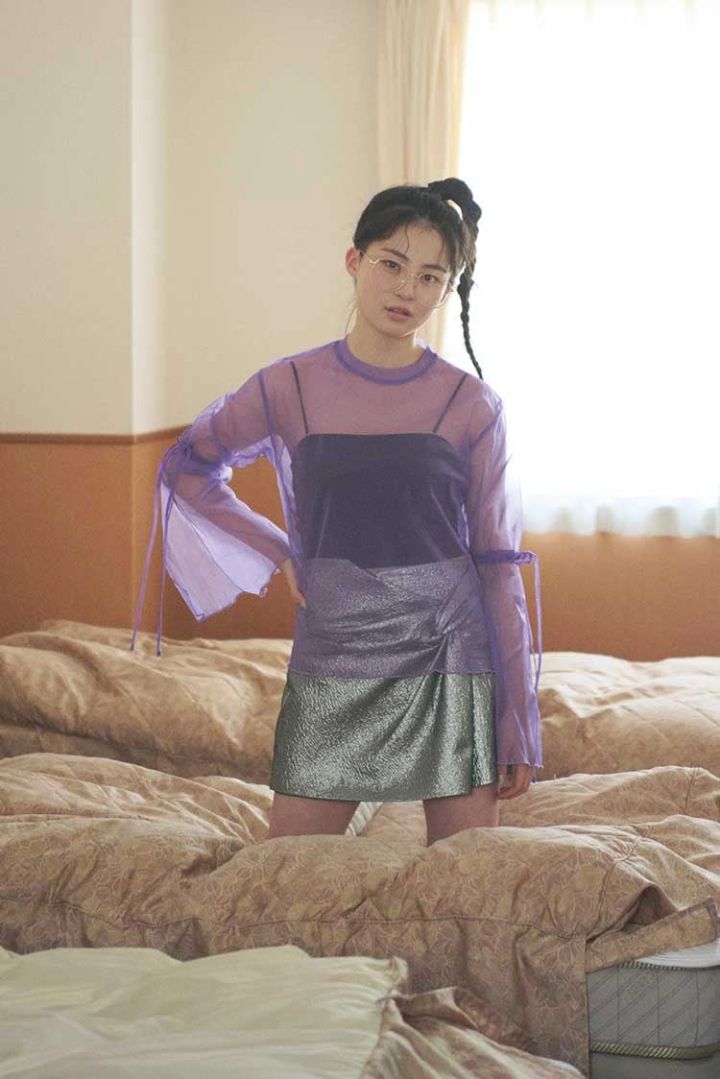 メタリックミニスカート 5,990円/ZARA(ザラ) パープル透けトップス 3,990円/miette 黒インナー 5,390円/LILLIAN CARAT(リリアン カラット) めがね 1,100円/ラティス
