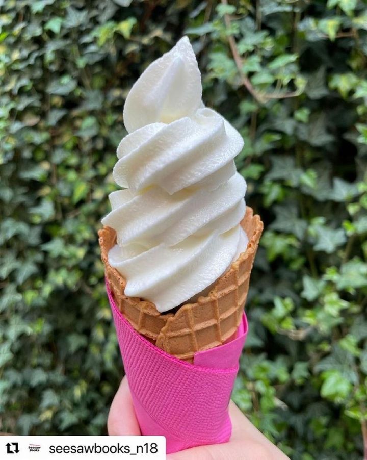 "北海道興部町「チーズ工房アドナイ」の特製バニラソフトです!一口食べると、ミルクの甘さがふわぁっと口の中に広がります。うちは本屋ですが、このソフトクリームを食べるためにお客様がたくさん来てくれています!"