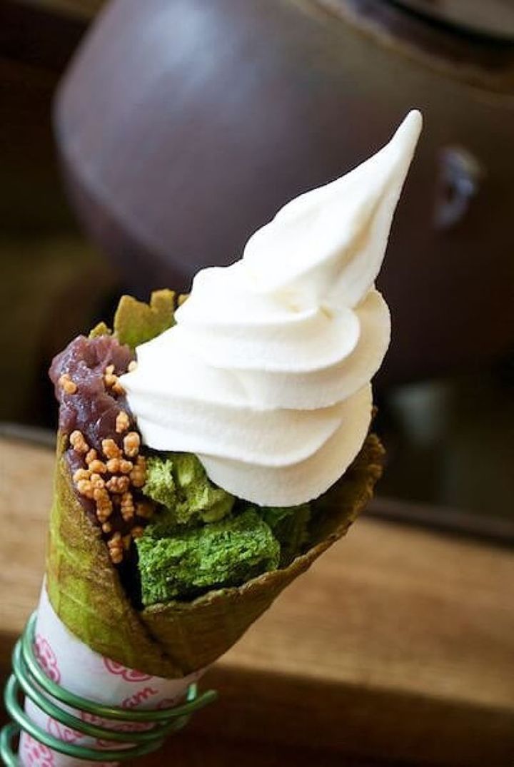 昭和八年創業の日本茶専門店が自慢の長期熟成抹茶をふんだんに使用した抹茶アイスクリームと北海道産ミルクを使用した甘みを抑えたさっぱりソフトクリームをドッキングパフェです。特注十勝産あんこと北海道玄米がアクセントで加わった北の大地のコントラストをイメージしたオリジナルスイーツです。
