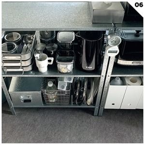 「キッチン用品はIKEAの“HYLLIS”というシェルフにまとめてオープン収納に。台所も部屋全体のグレイッシュなトーンに統一し、生活感が出にくいステンレスアイテムでまとめています。見せる部分と隠す部分を分けて、メリハリをつけることを意識。」(miyuaさん・会社員)@.miyua