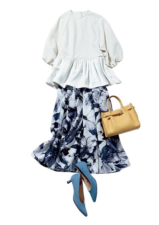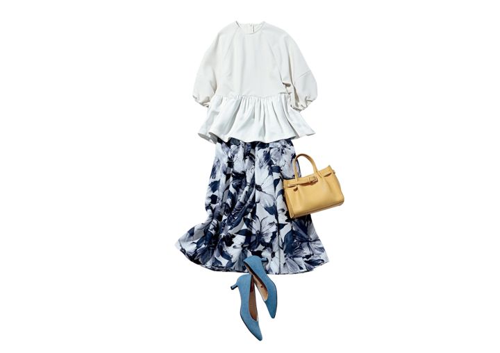 セットアップ(ブラウス)¥19,910/ミラ オーウェン ルミネ新宿2店 フラワースカート¥22,000/ジャスグリッティー イエローバッグ¥11,000/アンタイトル ブルーパンプス¥2,990/GU
