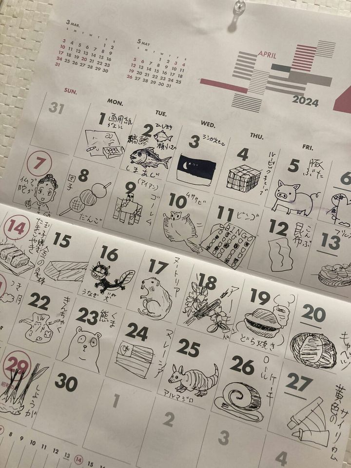 実家のカレンダー上で行われているのはなんと「絵しりとり」。誰がどういうきっかけで始めたのかはわかりませんが、家族のコミュニケーションとして、とても面白いですよね。絵もクオリティーが高く「うなぎ犬」や「黄色のサイリウム」など、ちょっと変わり種なものが描かれているのもポイントですね。